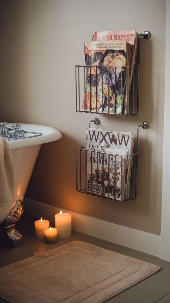 Install a magazine rack as art. Fill it with vintage comic books, quirky magazines, or illustrated bathroom etiquette guides.