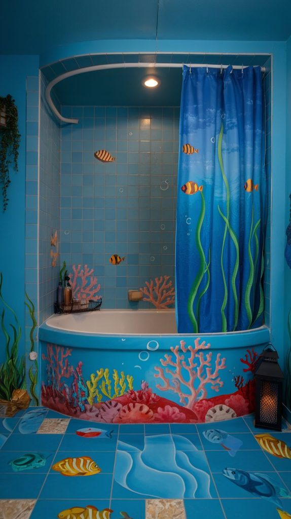 Add wall art that makes it look like you’re inside an aquarium, complete with fish, bubbles, and coral. Bonus points for humor, like a shark with sunglasses.