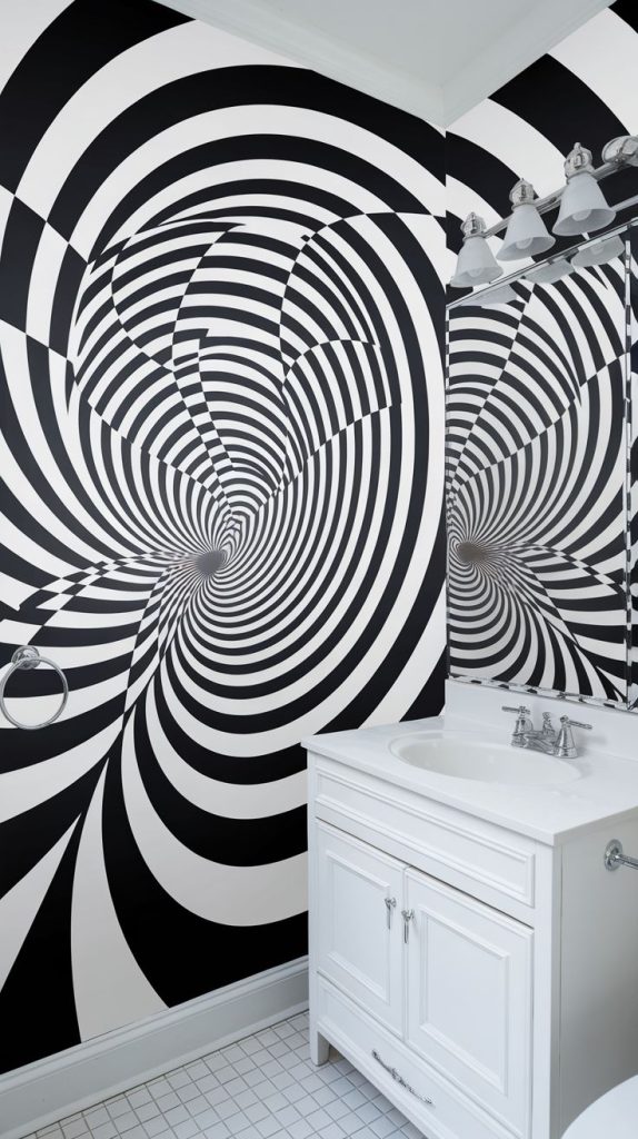Install optical illusion art that makes your bathroom feel larger or more surreal. Think portals, tunnels, or floating bubbles.